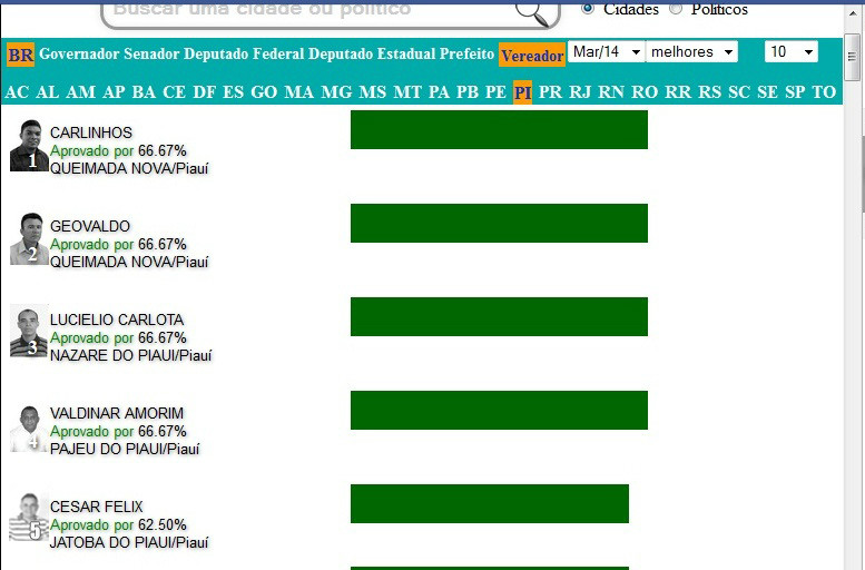 O vereador piauiense melhor aprovado na enquete política do maior site da rede social o facebock é o vereador de Queimada Nova, Carlinhos com 66,67%.